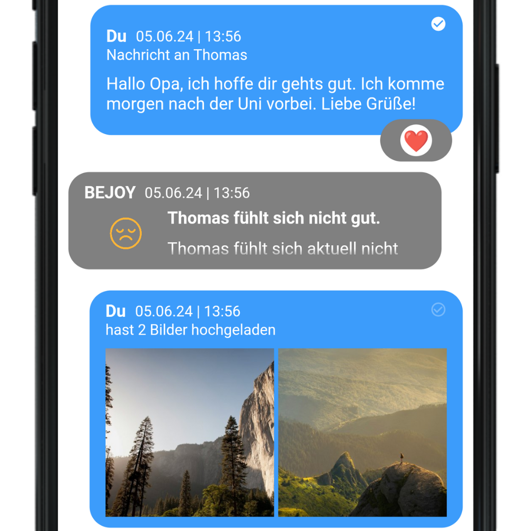 Mit unserer Stimmungsanzeige, die Gefühle in fünf Abstufungen darstellt, sind Sie immer über das emotionale Wohlbefinden Ihrer Liebsten informiert. Über die BEJOY-App bekommen Sie eine Nachricht und sind dadurch auch über räumliche Distanz miteinander verbunden.
