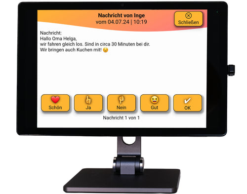 Fotos und Nachrichten direkt an Oma auf das BEJOY-Tablet senden, Oma reagiert mit einem Smiley und freut sich. Kommunikation für die ganze Familie wird durch BEJOY einfacher. Auch Videoanrufe werden bald möglich.